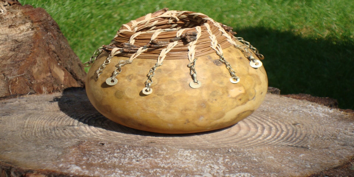 gevonden kalebassen en speciaal voor mij gekweekt in Frankrijk (van harte bedankt Philippe), Engelse biezen, schors, paardenhaar, dennennaalden, raffia, palmbloesem, lavendel, pitriet, mos en versiersels - looping, coiling, touw, fitsen open structuur