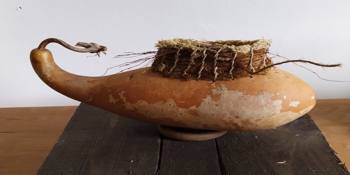2013 - 2020 Baobabvruchten gerecupereerd en gekregen, Engelse biezen, wilgenschors zelf ontschorst, mossen zelf geoogst in Aran (eiland Schotland), koord, leder, esparttogras zelf geoogst in Spanje, pitriet en pluimen van parkieten gekregen van een vriendin, en versiersels.