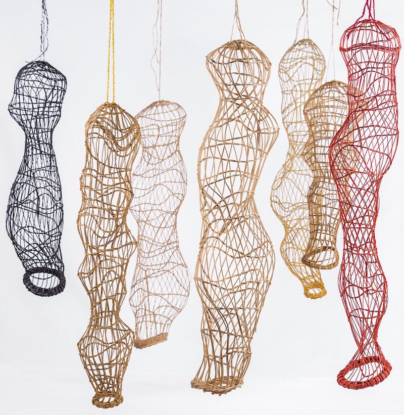 2019 - installatie van 13 cocons - bamboo schenen geverfd met pluimen, zeegrastouw, wilgenschors, pitriet naturel, gevlochten touw, plastiek, palmblad, berkenschors, kuzu, oasis, gevlochten espartogras, bullrush, touw - per stuk: diameter 15 à 20 cm