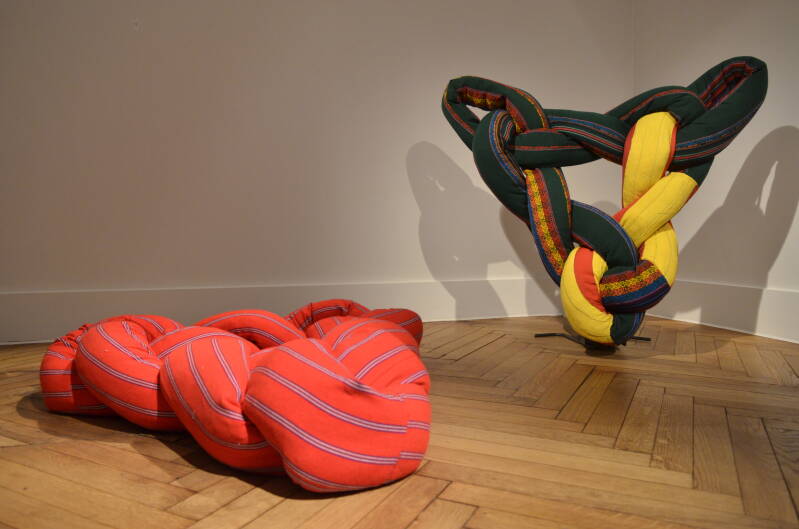 2018 - houten stokken, uitgekozen restanten stoffen met aangepast touw die de kleuren van het schilderij benaderen - open coiling - H165cm x B100cm x L100cm